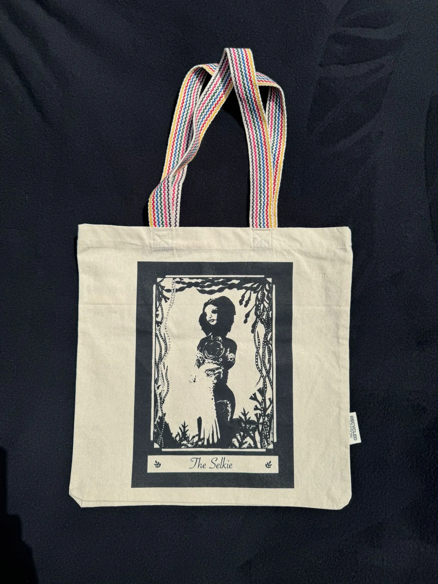 Screen printed Selkie tote bag made from recycled cotton. Monotone black ink with rainbow handles. 37cm square. £15. P&P £5